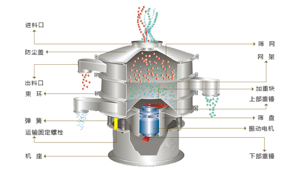 三次元圓形旋振篩采用YZUL立式振動電機作為激振源,通過振動電機上下兩端的偏心重錘將旋轉運動轉變為水平、垂直、傾斜的三次元運動,并傳遞到旋振篩的篩面上;物料通過入料口進入設備內,根據不同物料篩分要求,物料經過1-5層采用不同目數的金屬編織篩網的篩分層,在這個過程中,位于各層的篩網下的清網裝置(彈跳球)通過頻率振動不斷撞擊不銹鋼篩網,使篩網上層物料能夠順暢的透網篩分,并有效解決了物料堵網問題出現,不同目數的物料通過各層對應目數的篩網后在各層的出料口排出,終實現篩選除雜或過濾分級的目的。